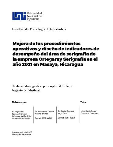 Cabezas del Castillo, Reynaldo Ezequiel Ismesh and Molina Brenes, Juliocarlos Obarú and Vega Cruz, Daniel Enrique (2022) Mejora de los procedimientos operativos y diseño de indicadores de desempeño del área de serigrafía de la empresa Ortegaray Serigrafía en el año 2021 en Masaya, Nicaragua. Other thesis, Universidad Nacional de Ingeniería.