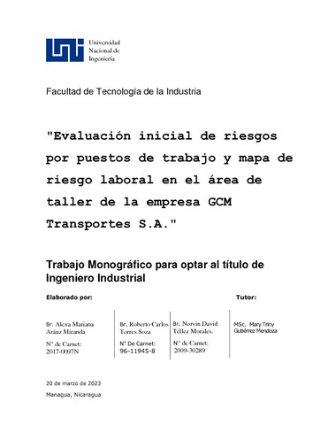 Aráuz Miranda, Alexa Mariana and Torres Soza, Roberto Carlos and Téllez Morales, Norvin David (2023) Evaluación inicial de riesgos por puestos de trabajo y mapa de riesgo laboral en el área de taller de la empresa GCM Transportes S.A. Other thesis, Universidad Nacional de Ingeniería.