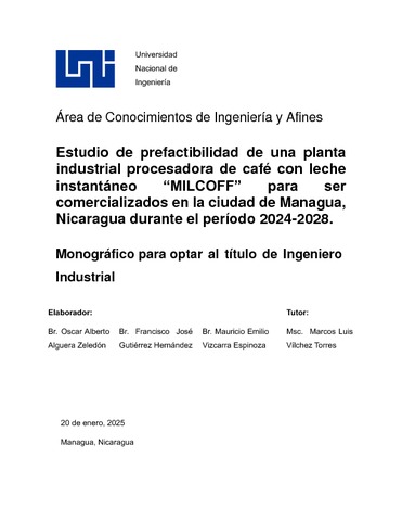 Alguera Zeledón, Oscar Alberto and Gutiérrez Hernández, Francisco José and Vizcarra Espinoza, Mauricio Emilio (2025) Estudio de prefactibilidad de una planta industrial procesadora de café con leche instantáneo MILCOFF para ser comercializados en la ciudad de Managua, Nicaragua durante el periodo 2024-2028. Other thesis, Universidad Nacional de Ingeniería.