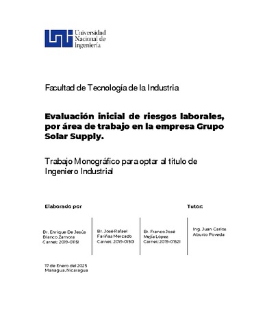 Blanco Zamora, Enrique de Jesús and Fariñas Mercado, José Rafael and Mejía López, Franco José (2025) Evaluación inicial de riesgos laborales, por área de trabajo en la empresa Grupo Solar Supply. Other thesis, Universidad Nacional de Ingeniería.