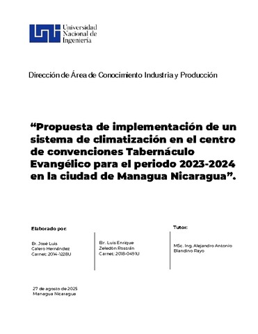 Calero Hernández, José Luis and Zeledón Rostrán, Luis Enrique (2025) Propuesta de implementación de un sistema de climatización en el centro de convenciones Tabernáculo Evangélico para el periodo 2023-2024 en la ciudad de Managua- Nicaragua. Other thesis, Universidad Nacional de Ingeniería.