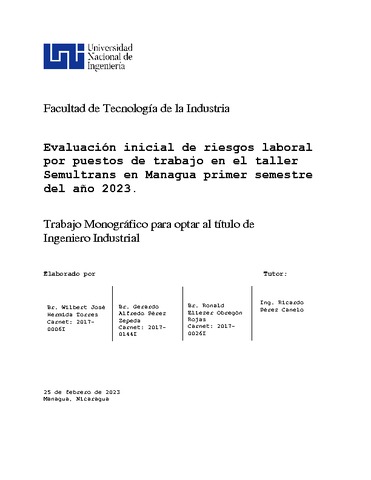 El estudio consiste en la evaluación inicial de los riesgos laborales presentes en los diferentes puestos de trabajo del taller Semultrans, ubicado en la ciudad de Managua, durante el primer semestre del año 2023. La investigación identifica los peligros asociados a actividades mecánicas, eléctricas, ergonómicas y operativas, con el objetivo de proponer medidas para prevenir accidentes y enfermedades ocupacionales.