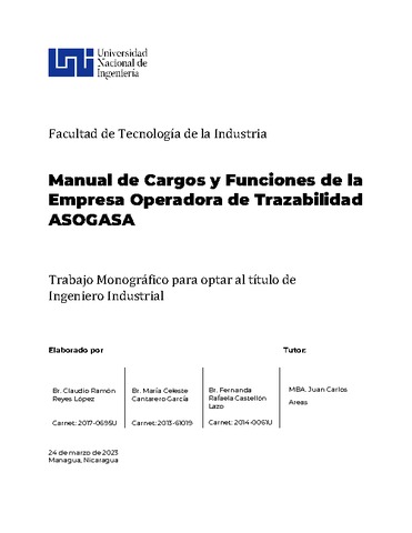 Reyes López, Claudio Ramón and Cantarero García, María Celeste and Castellón Lazo, Fernanda Rafaela (2023) Manual de Cargos y Funciones de la Empresa Operadora de Trazabilidad ASOGASA. Other thesis, Universidad Nacional de Ingeniería.