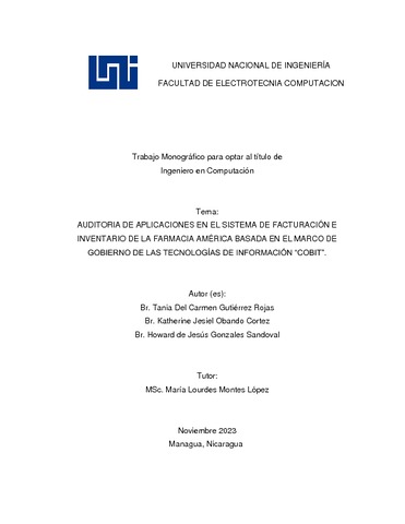 Gutiérrez Rojas, Tania Del Carmen and Obando Cortez, Katherine Jesiel and Gonzales Sandoval, Howard de Jesús (2023) Auditoria de aplicaciones en el sistema de facturación e inventario de la farmacia américa basada en el marco de gobierno de las tecnologías de información “COBIT”. Other thesis, Universidad Nacional de Ingeniería.