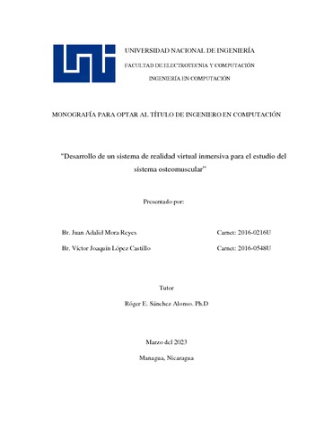 Mora Reyes, Juan Adalid and López Castillo, Víctor Joaquín (2023) Desarrollo de un sistema de realidad virtual inmersiva para el estudio del sistema osteomuscular. Other thesis, Universidad Nacional de Ingeniería.