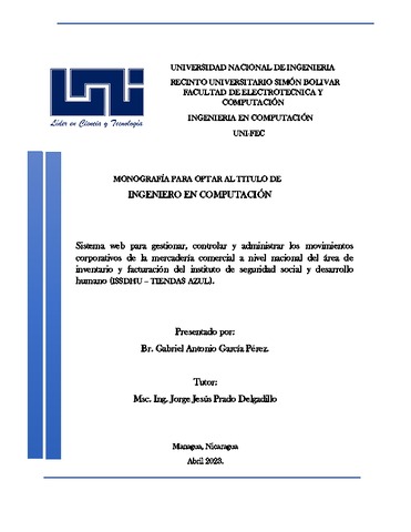 García Pérez, Gabriel Antonio (2023) Sistema web para gestionar, controlar y administrar los movimientos corporativos de la mercadería comercial a nivel nacional del área de inventario y facturación del instituto de seguridad social y desarrollo humano ISSDHU-Tiendas Azul. Other thesis, Universidad Nacional de Ingeniería.