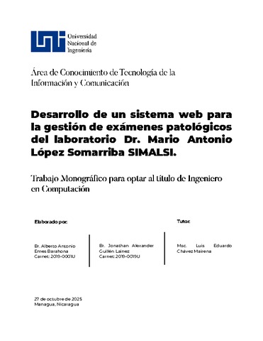 Emes Barahona, Alberto Antonio and Guillén Lainez, Jonathan Alexander (2025) Desarrollo de un sistema web para la gestión de exámenes patológicos del laboratorio Dr. Mario Antonio López Somarriba SIMALSI. Other thesis, Universidad Nacional de Ingeniería.
