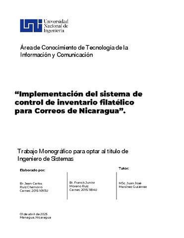 Ruiz Chamorro, Jean Carlos and Moreno Ruiz, Franck Junior (2025) Implementación del sistema de control de inventario filatélico para Correos de Nicaragua. Other thesis, Universidad Nacional de Ingeniería.