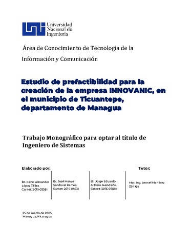 López Téllez, Kevin Alexander and Sandoval Ramos, José Manuel and Arévalo Avendaño, Jorge Eduardo (2025) Estudio de prefactibilidad para la creación de la empresa INNOVANIC, en el municipio de Ticuantepe, departamento de Managua. Other thesis, Universidad Nacional de Ingeniería.