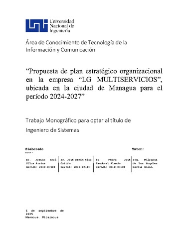 Ulloa Araica, Jasson Paul and Rizo Gaitán, José Ramón and Sandoval Alemán, Pedro José (2025) Propuesta de plan estratégico organizacional en la empresa “LG MULTISERVICIOS”, ubicada en la ciudad de Managua para el período 2024-2027. Other thesis, Universidad Nacional de Ingeniería.