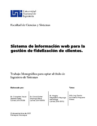 Zepeda Téllez, Cristopher Josué and Mayorga Mena, Gloria Esther and Mayorga Maradiaga, Magaly (2023) Sistema de información web para la gestión de fidelización de clientes. Other thesis, Universidad Nacional de Ingeniería.