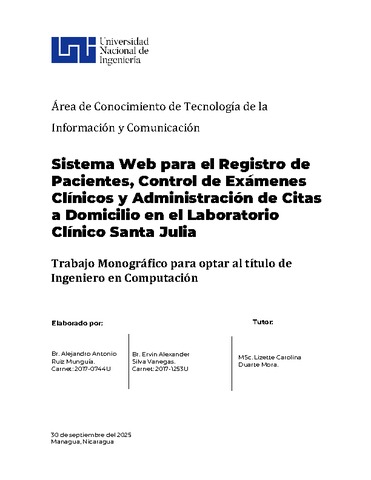 Ruiz Munguía, Alejandro Antonio and Silva Vanegas, Ervin Alexander (2025) Sistema Web para el Registro de pacientes, Control de Exámenes Clínicos y Administración de Citas a Domicilio en el Laboratorio Clínico Santa Julia. Other thesis, Universidad Nacional de Ingeniería.