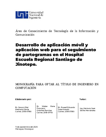 Medrano Dávila, Gerson Eliel and Ordoñez Ramírez, Walter Rene Francisco and Soza Arévalo, Russell Eduardo (2025) Desarrollo de aplicación móvil y aplicación web para el seguimiento de partogramas en el Hospital Escuela Regional Santiago de Jinotepe. Other thesis, Universidad Nacional de Ingeniería.