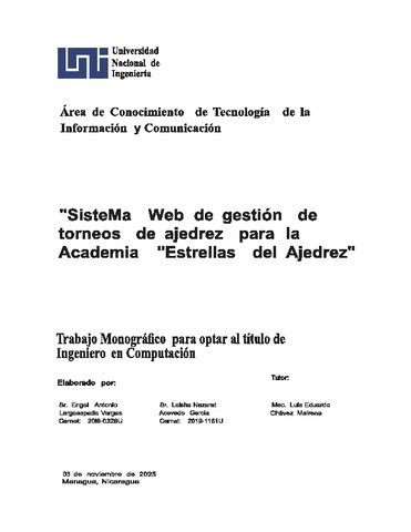 Largaespada Vargas, Engel Antonio and Acevedo García, Laisha Nazaret (2025) Sistema web de gestión de tornos de ajedrez para la Academia Estrellas del Ajedrez. Other thesis, Universidad Nacional de Ingeniería.