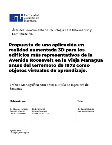 Castellón Castillo, Eduardo Ignacio and Zúniga Sánchez, Luis Carlos (2025) Propuesta de una aplicación en realidad aumentada 3D para los edificios más representativos de la Avenida Roosevelt en la Vieja Managua antes del terremoto de 1972 como objetos virtuales de aprendizaje. Other thesis, Universidad Nacional de Ingeniería.