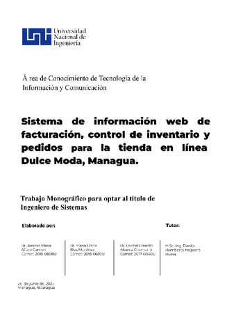 Alfaro Carrión, Jonissa María and Blas Martínez, María Elena and Abarca Chamorro, Leonel Ernesto (2025) Sistema de información web de facturación, control de inventario y pedidos para la tienda en línea Dulce Moda, Managua. Other thesis, Universidad Nacional de Ingeniería.