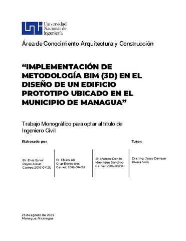 Reyes Arauz, Elvis Esmir and Cruz Benavides, Efrain Ali and Huembes Sandino, Marcos Danilo (2025) Implementación de metodología BIM (3D) en el diseño de un edificio prototipo ubicado en el municipio de Managua. Other thesis, Universidad Nacional de Ingeniería.