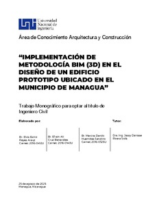 El presente trabajo propone la implementación de la metodología BIM (Building Information Modeling) en el diseño integral de un edificio académico de dos niveles, ubicado en el municipio de Managua. Esta propuesta surge como respuesta a la necesidad de optimizar los procesos constructivos, mejorar la coordinación interdisciplinaria y reducir los errores en etapas tempranas del proyecto, mediante el uso de tecnologías de modelado tridimensional (3D).