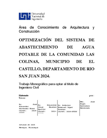 Hernández Pérez, José Alexander and Morales Aguilar, Alexandre Josué and López Rosales, Anderson Enmanuel (2025) Optimización del sistema de abastecimiento de agua potable de la comunidad Las Colinas, municipio de El Castillo, departamento de Rio San Juan 2024. Other thesis, Universidad Nacional de Ingeniería.