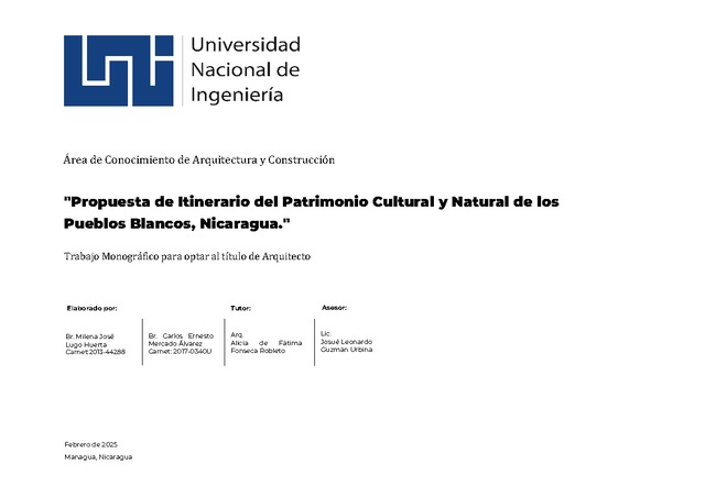 Lugo Huerta, Milena José and Mercado Álvarez, Carlos Ernesto and Fonseca Robleto, Alicia de Fátima (2025) Propuesta de Itinerario del Patrimonio Cultural y Natural de los Pueblos Blancos, Nicaragua. Other thesis, Universidad Nacional de Ingeniería.