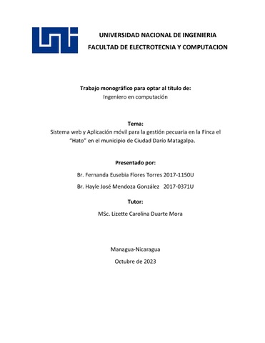 Flores Torres, Fernanda Eusebia and Mendoza González, Hayle José (2023) Sistema web y Aplicación móvil para la gestión pecuaria en la Finca el “Hato” en el municipio de Ciudad Darío Matagalpa. Other thesis, Universidad Nacional de Ingeniería.