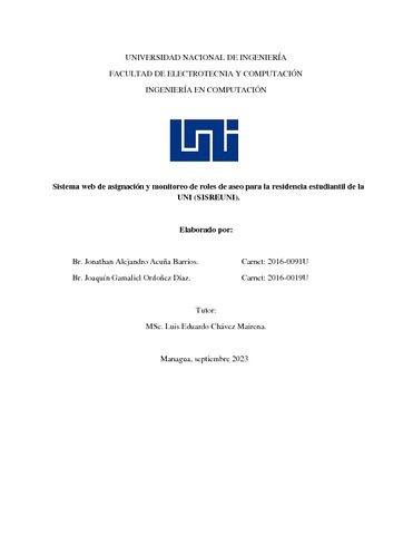 Acuña Barrios, Jonathan Alejandro and Ordoñez Díaz, Joaquín Gamaliel (2023) Sistema web de asignación y monitoreo de roles de aseo para la residencia estudiantil de la UNI (SISREUNI). Other thesis, Universidad Nacional de Ingeniería.