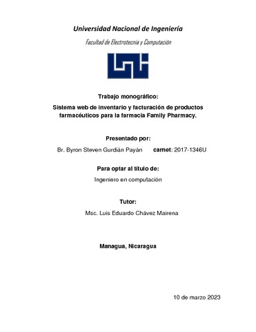 Gurdián Payán, Byron Steven (2023) Sistema web de inventario y facturación de productos farmacéuticos para la farmacia Family Pharmacy. Other thesis, Universidad Nacional de Ingeniería.