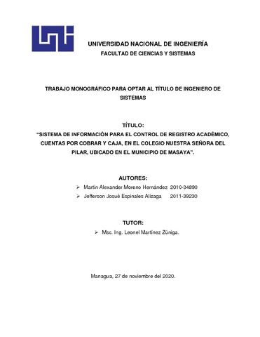 Moreno Hernández, Martin Alexander and Espinales Alizaga, Jefferson Josué (2020) Sistema de Información para el Control de Registro Académico, Cuentas por Cobrar y Caja, en el Colegio Nuestra Señora del Pilar, ubicado en el municipio de Masaya. Other thesis, Universidad Nacional de Ingeniería.