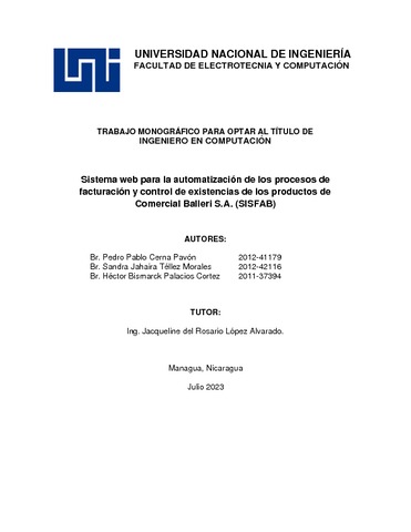 Cerna Pavón, Pedro Pablo and Téllez Morales, Sandra Jahaira and Palacios Cortez, Héctor Bismarck (2023) Sistema web para la automatización de los procesos de facturación y control de existencias de los productos de Comercial Balleri S.A. (SISFAB). Other thesis, Universidad Nacional de Ingeniería.