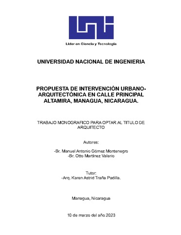 Gómez Montenegro, Manuel Antonio and Martínez Valerio, Otto (2023) Propuesta de intervención urbano arquitectónica en calle principal Altamira, Managua, Nicaragua. Other thesis, Universidad Nacional de Ingeniería.