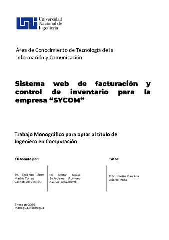 Madriz Torrez, Rolando José and Balladares Romero, Jordán Josué (2026) Sistema web de facturación y control de inventario para la empresa SYCOM. Other thesis, Universidad Nacional de Ingeniería.