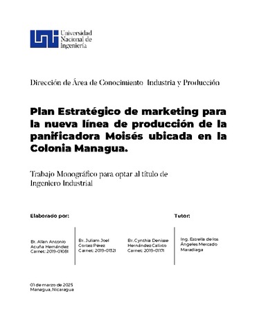 Acuña Hernández, Allan Antonio and Cortez Pérez, Juliam Joel and Hernández Calixto, Cynthia Denisse (2025) Plan Estratégico de marketing para la nueva línea de producción de la panificadora Moisés ubicada en la Colonia Managua. Other thesis, Universidad Nacional de Ingeniería.