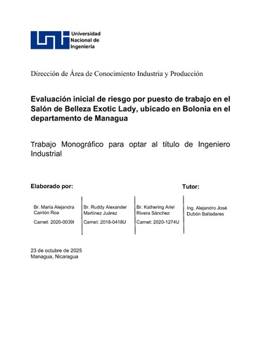 Carrión Roa, María Alejandra and Martínez Juárez, Ruddy Alexander and Rivera Sánchez, Kathering Ariel (2025) Evaluación inicial de riesgo por puesto de trabajo en el Salón de Belleza Exotic Lady, ubicado en Bolonia en el departamento de Managua. Other thesis, Universidad Nacional de Ingeniería.