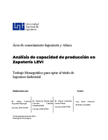 Arguello Bojorge, Misty Cristina and Castilla Largaespada, Nahomy Nicole del Carmen and Larios Pérez, María Gabriela (2024) Análisis de capacidad de producción en Zapatería LEVI. Other thesis, Universidad Nacional de Ingeniería.