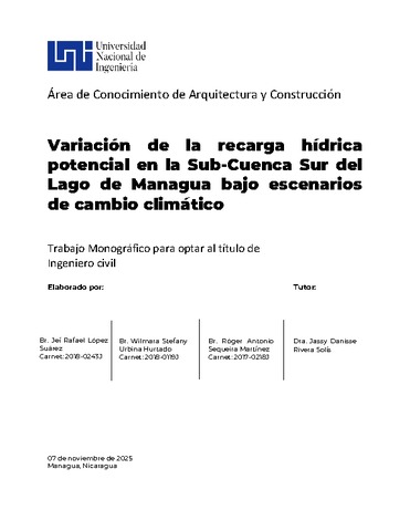 López Suárez, Jeí Rafael and Urbina Hurtado, Wilmara Stefany and Sequeira Martínez, Róger Antonio (2025) Variación de la recarga hídrica potencial en la Sub-Cuenca Sur del Lago de Managua bajo escenarios de cambio climático. Other thesis, Universidad Nacional de Ingeniería.